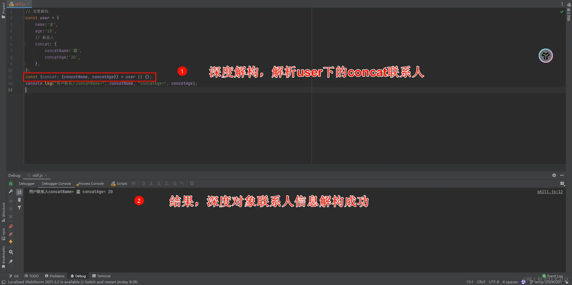 - 深度解构:可以解构嵌套的对象,方便地获取深层属性。