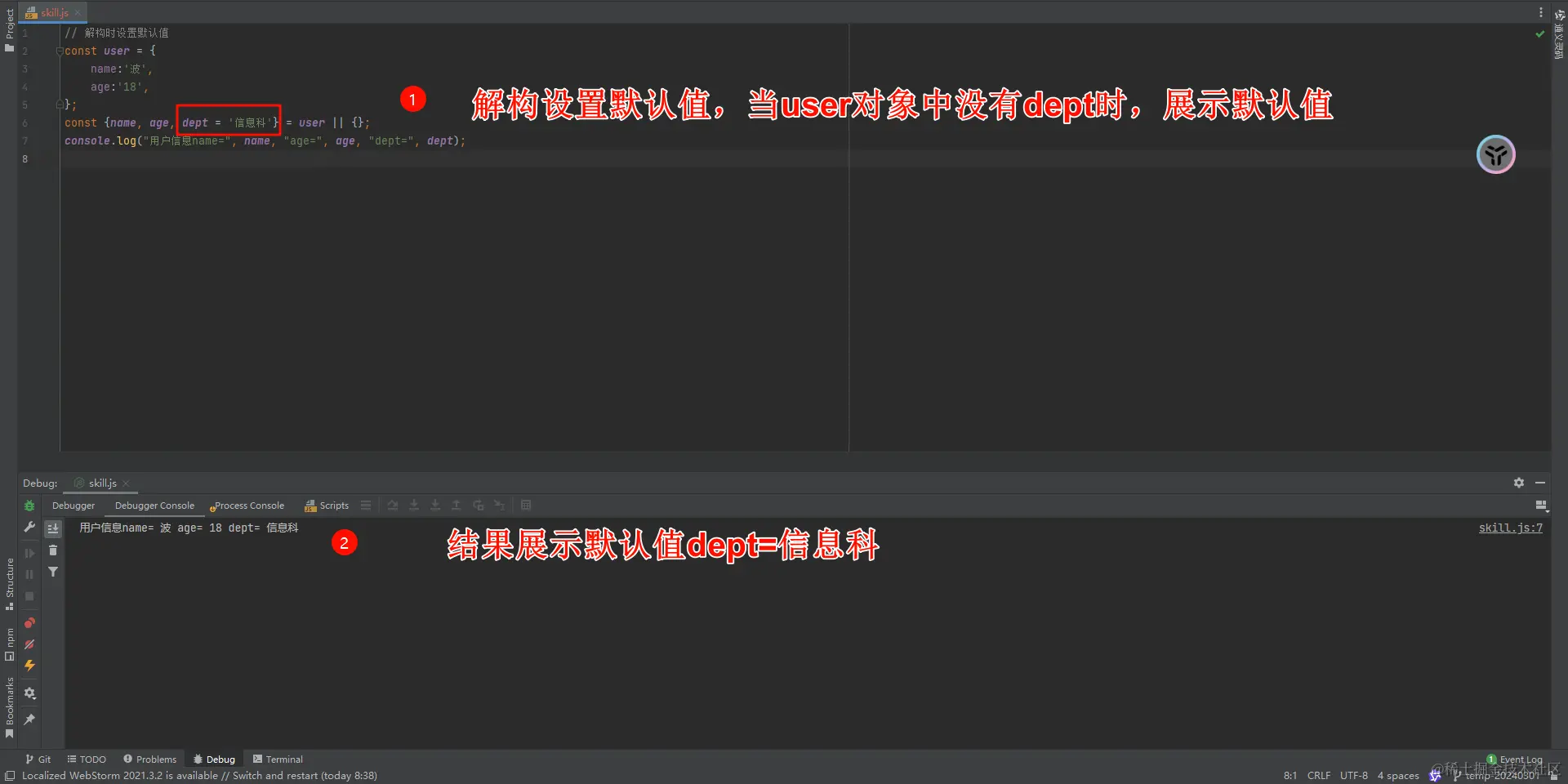 通过模拟接口获取用户user对象,解构user对象时,没有dept科室字段时,可以加入默认值