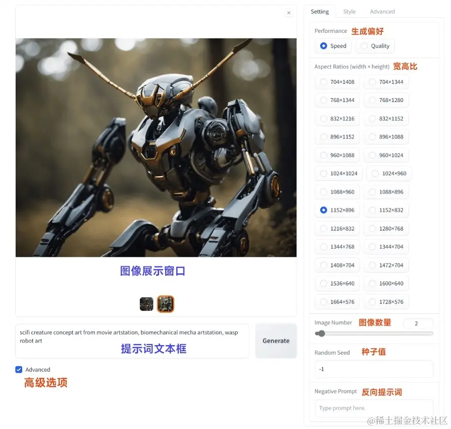 直接在文本框内输入提示词,然后点击“Generate”按钮就可以生成图像了。勾选“Advanced”可以进行更多高级设置。 生成好的图像会自动保存在根目录的 outputs 文件夹内。