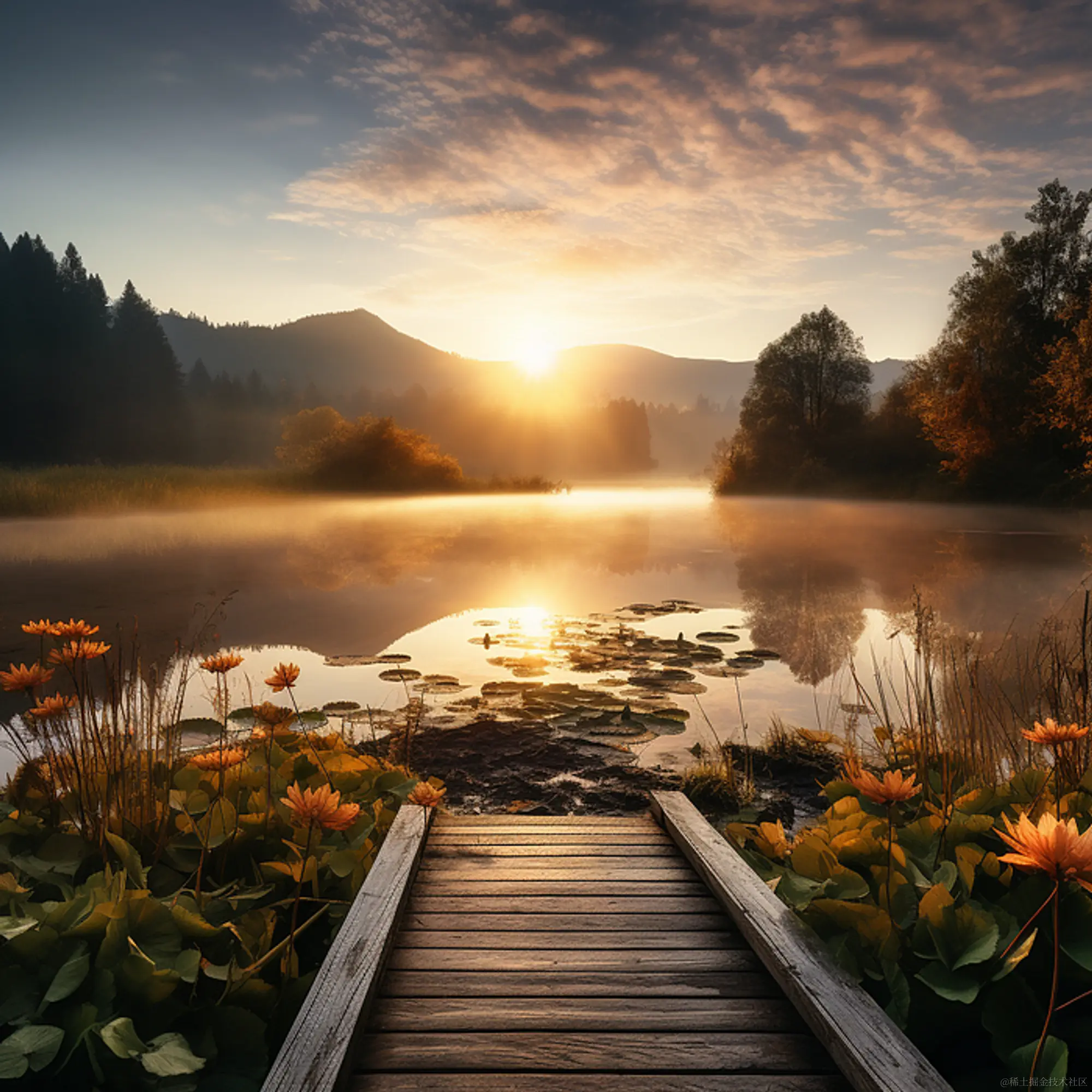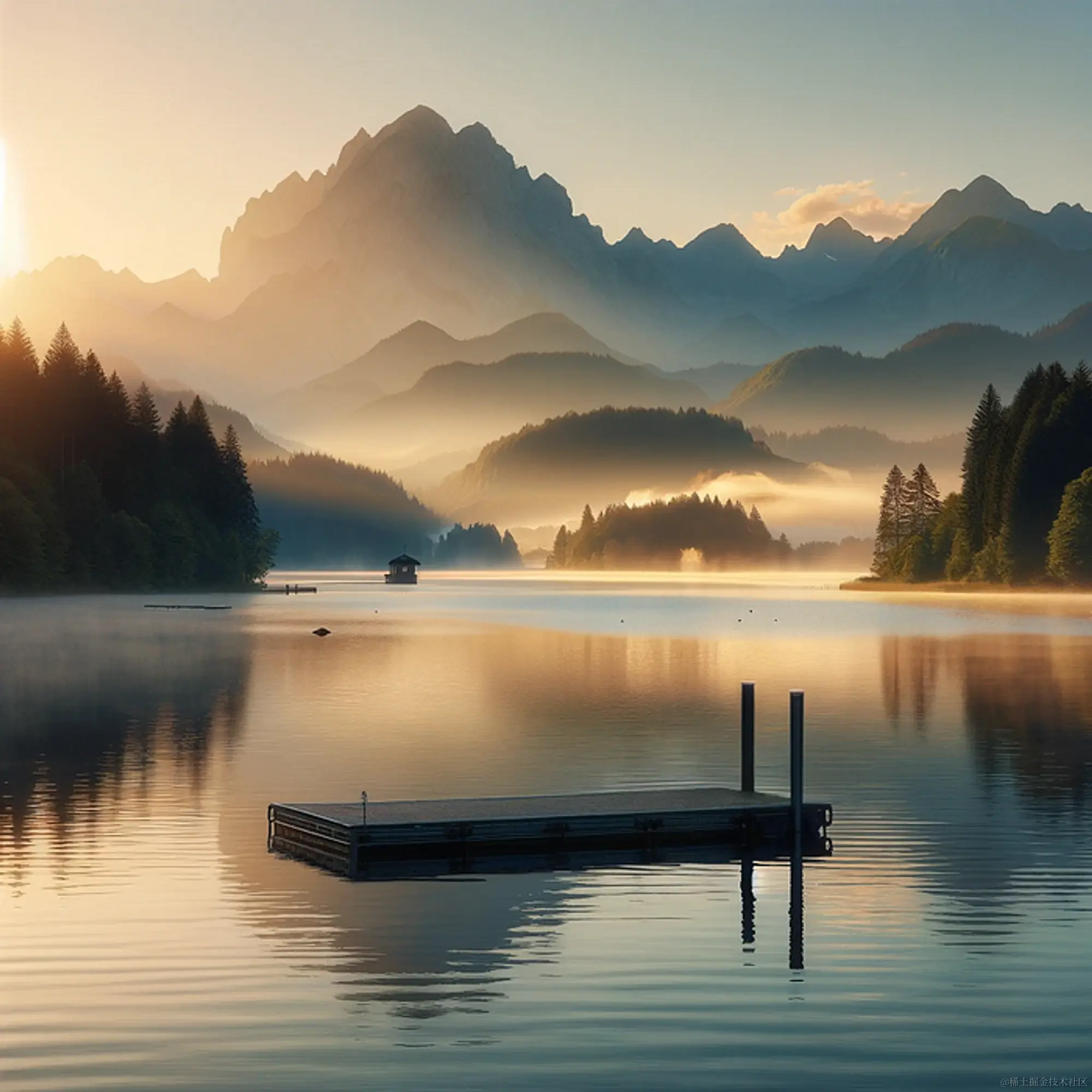 prompt:beautiful landscape with a lake in the foreground, with a dock, and mountains in the background, in the early morning with sunrise and mist on the lake.