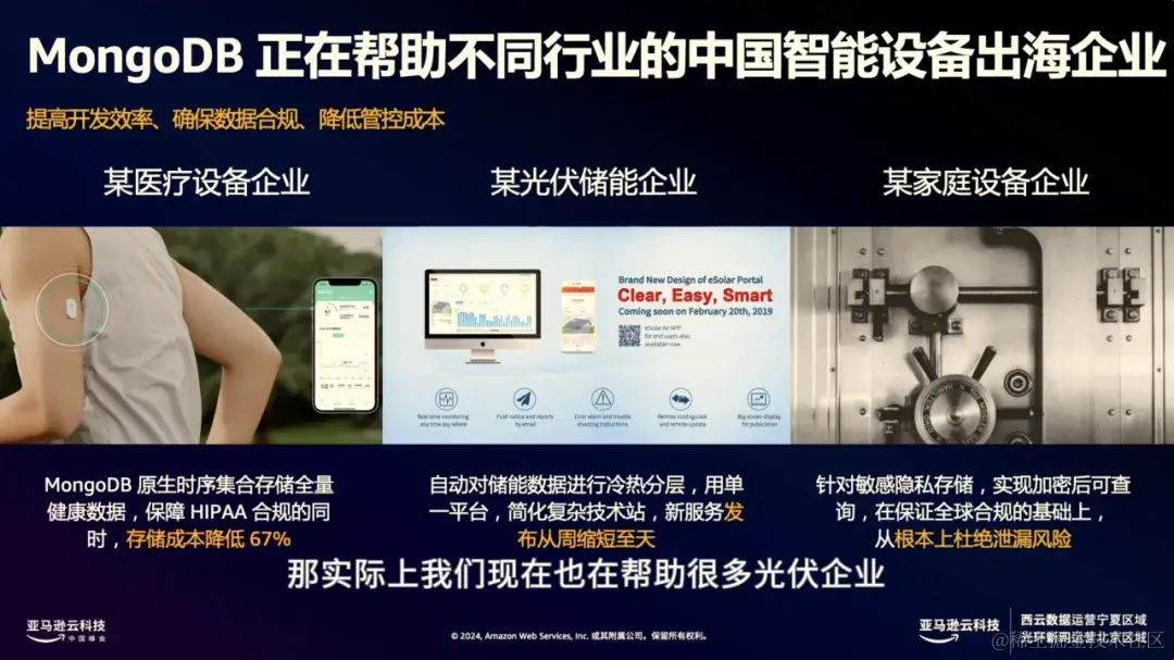 MongoDB 现在也在帮助众多光伏和储能的企业出海,因为MongoDB大大地简化了这些企业的技术栈,因为只需要一套数据库,MongoDB把业务发布周期短到了天,只要有业务需要,很快就可以发布出来。