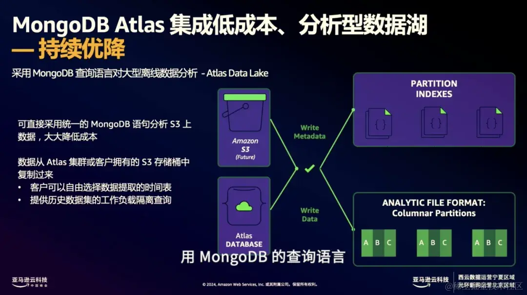 能不能在这个基础上再优化?答案是肯定的,因为在很多设备的场景中,有一部分数据是需要实时处理的。但有一部分数据可能只是做历史归档和统计,数据其实根本不需要进数据库了,可以直接把它放到 S3 上,因为S3是非常低成本的存储,直接把它放在 S3 上,只要格式是JSON,那么 MongoDB就可以支持用 MongoDB 的接口和查询语言直接搜索 S3 上的数据。只要开发一套接口,这些非实时的数据就可以直接在 S3 上处理掉。这样可以再次压降成本。