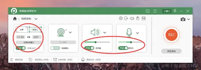 步骤2:在视频录制页面中,根据需要调整录制区域,还可以选择是否录制音频和摄像头画面,并调节它们的参数大小。