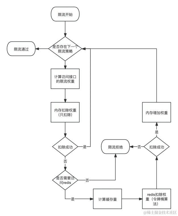 - 每种限流策略都会设置好总允许的权重值,每次访问通过redis的lua脚本进行权重的扣除和增加,直到为0,扣除不了的则触发拒绝