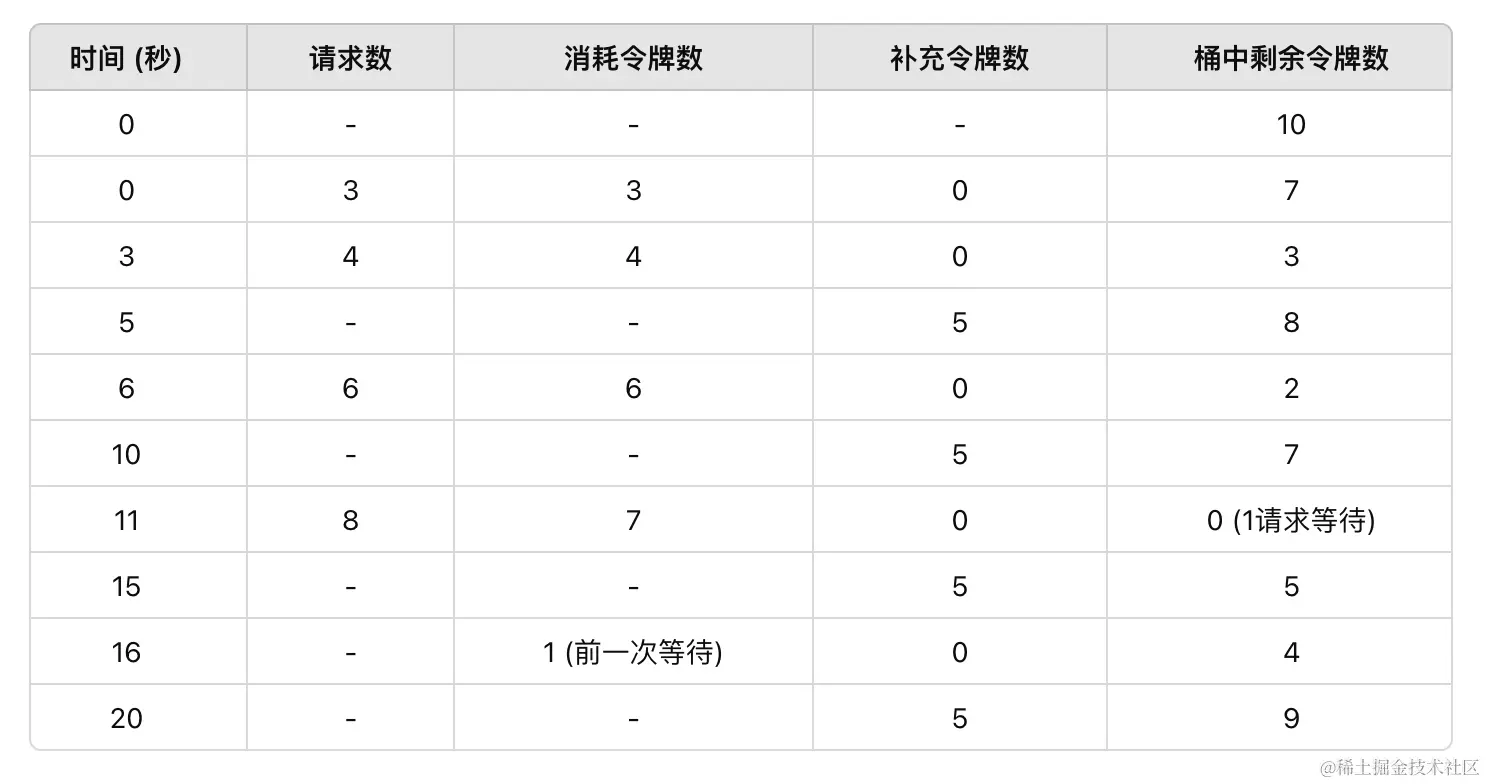 - 简单讲一下限流使用的令牌桶,网关会在redis中记录剩余令牌数和上次补充令牌的时间点,redis的key是限流维度生成的唯一id,比如用户维度则是特殊前缀+用户id。假设我们有一个令牌桶,初始令牌数为10,每5秒钟补充5个令牌,桶的最大容量也是10个令牌。那么令牌使用情况如下图:
