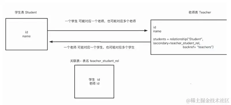 - 第三个参数backref是给当前表起个别名,通过backref将两个表建立关联关系,可以通过Student.teachers去反向访问老师表