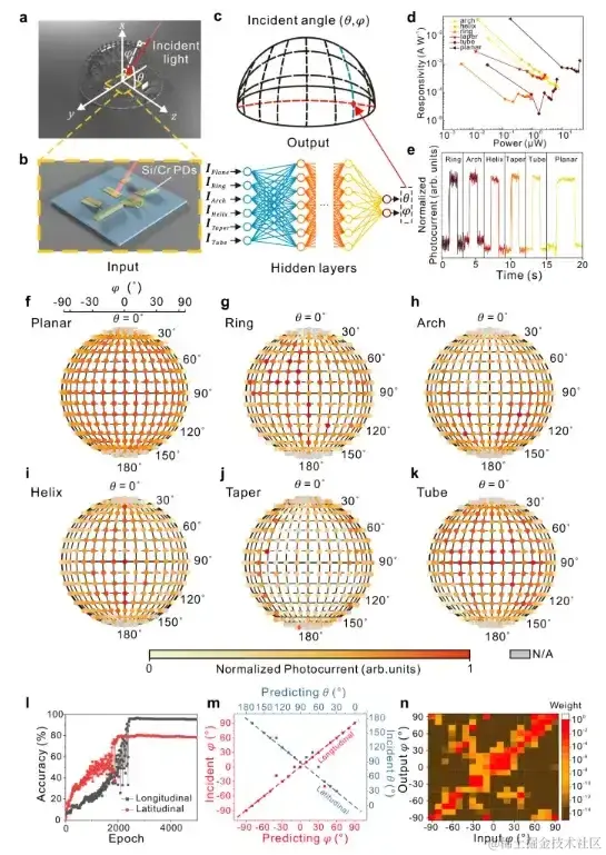 研究团队针对图 f - k 中每个光电探测器收集了 275 个入射点的数据,进行了三维空间入射光光电相应数据库的构建。利用深度神经网络对经度与纬度数据集的训练,分别展示出了 95% 与 78% 的精确度(上图中 l)。基于上述技术可以分别在入射光方向的经度与纬度探测上实现 83% 与 71% 的精确度, 入射光角度分辨率达到 ~10°,且从上图 n 中可见其角度预测权重显著。