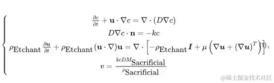 其中,c 为蚀刻剂浓度,u 为蚀刻剂流动速度,D 为扩散系数,k 为反应速率系数,n 为法向向量,ρ 为密度,μ 为动态粘度系数,v 为法向网格速度,M 为摩尔质量。