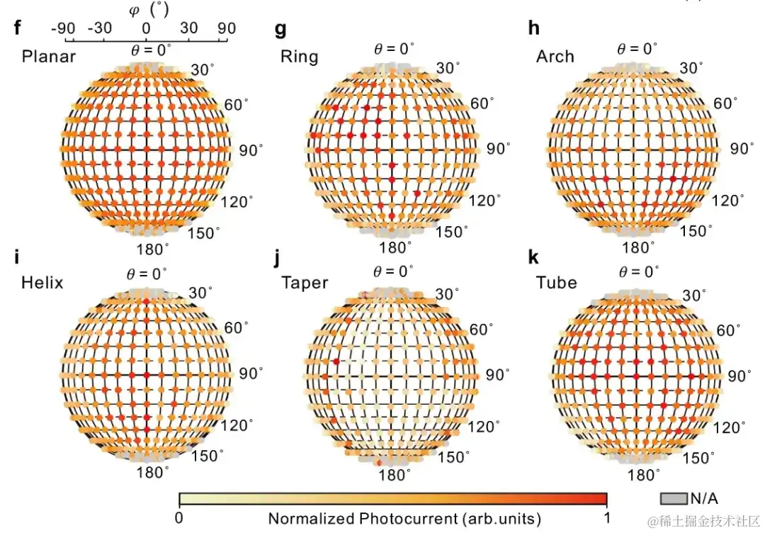在测量了从不同坐标入射光的光响应后,研究团队将每个坐标的光电流归一化并按结构类型进行了分类。同时,为了便于直观地比较数据,每个结构的归一化光电流将通过光控器在 YZ 平面上得投影显示出来。研究团队还建立了用 θ 和 φ 表示的球面坐标,帮助识别入射光在投影球面上位置。