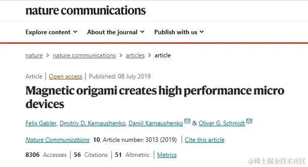 权威期刊 Nature Communications 收录了不少涉及该方面的研究结果,比如早在 2019 年由 Felix Gabler 等人发布的研究成果「Magnetic origami creates high performance micro devices」,其中提到一种将高纵横比纳米膜组装成微电子期间的替代方法,可通过外部磁场的影响远程助其组装,从而提高芯片制造工艺。