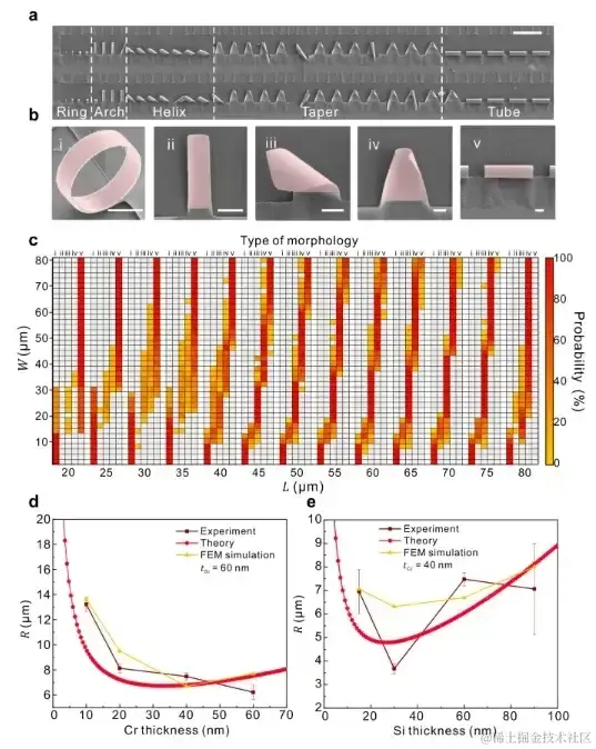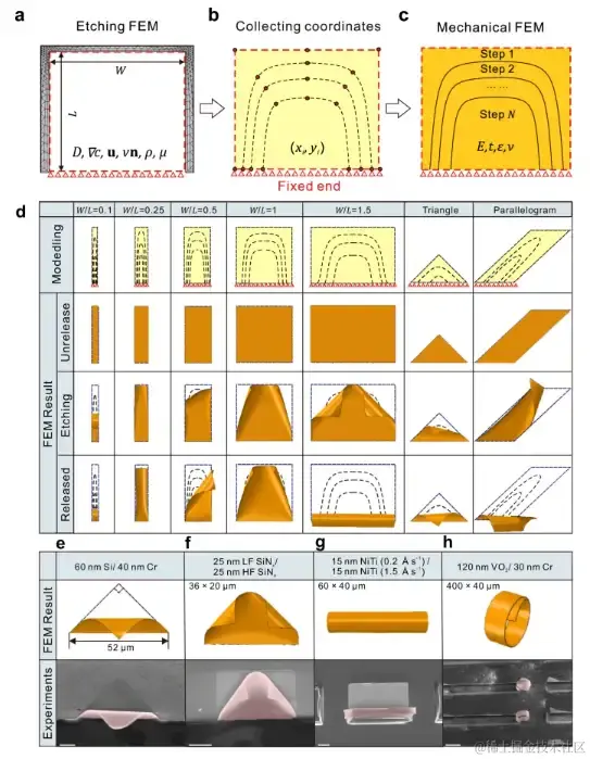 由于单端固定双层纳米膜结构的边界条件不对称、实际释放过程复杂、几何变形大,故采用弹性薄板大扰度方程进行结构设计不能准确反映该过程。仅考虑从相对边缘释放纳米膜的三维组装只能呈现管状结构,双层纳米膜的模拟结果则呈现出了更好的准确性,并且成功显示了随宽度变化的形态, (如上图中 d 所示)。