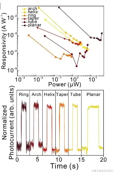 结果显示,未释放的 Si/Cr 平面 (Planar) 光电探测器(上图中 f)、环形 (Ring) 光电探测器(上图中 g)、拱形 (Arch) 光电探测器(上图中 h)、螺旋 (Helix) 光电探测器(上图中 i)、锥形 (Taper) 光电探测器(上图中 j)、管状 (Tube) 光电探测器(上图中 k),对入射角探测显示出不同的结果。