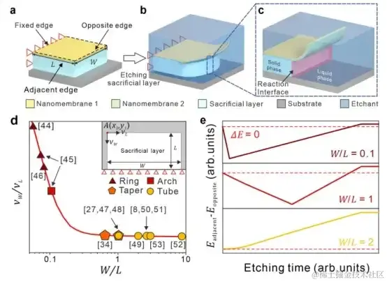 图中 b 展示了固定边缘预应变双层纳米膜的释放过程。图中 c 进一步揭露了牺牲层湿法蚀刻 (etching) 过程,蚀刻剂从液相扩散到固液界面 (solid-liquid interface),并与牺牲层在界面中发生化学反应。