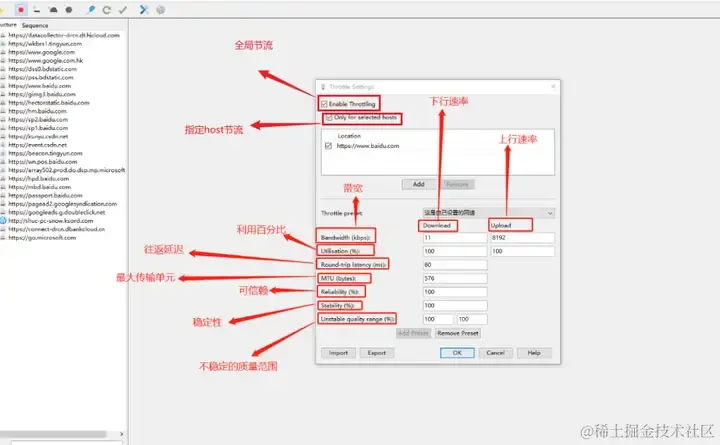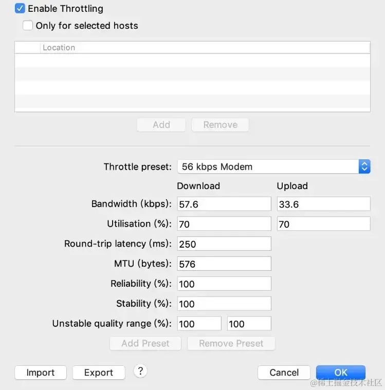 在 Proxy -> Throttle Setting,然后选择 Enable Throttling,在 Throttle Preset 下选择网络类型即可,具体设置可以自行确定。