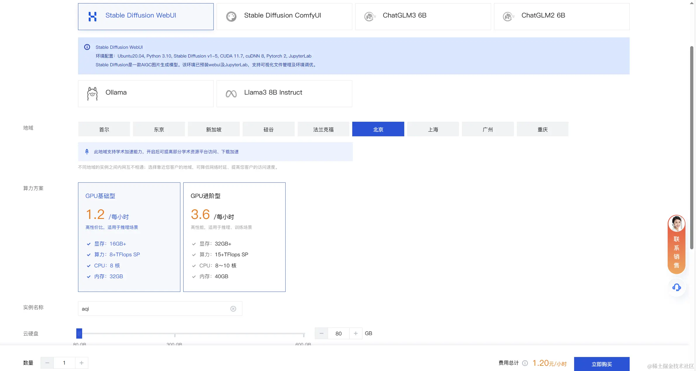 万事俱备,然后就是创建实例,这里我选择北京区域、模型选择Stable Diffusion WebUI,ComfyUI工作流有点难度,不适合新手。基础型套餐够用,最后点击立即购买,完成实例的创建。