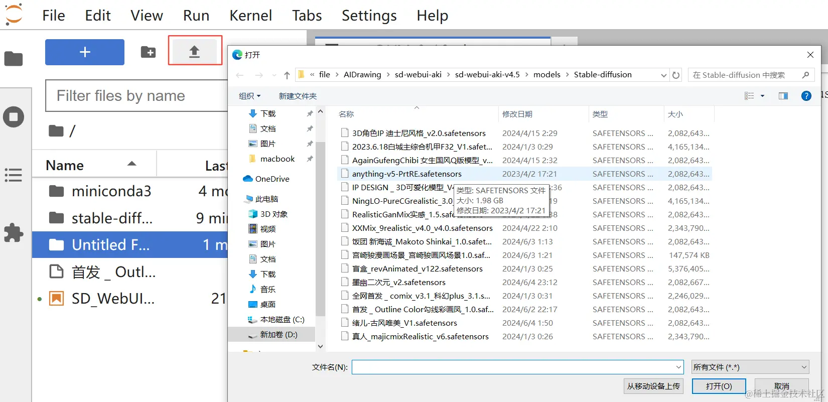 当前目录下只有一个最原始的大模型,所以我们可以wget下载网络上的大模型,也可以通过上传功能,将本地的大模型上传到HAI服务主机上,这里我将本地模型上传到HAI上。