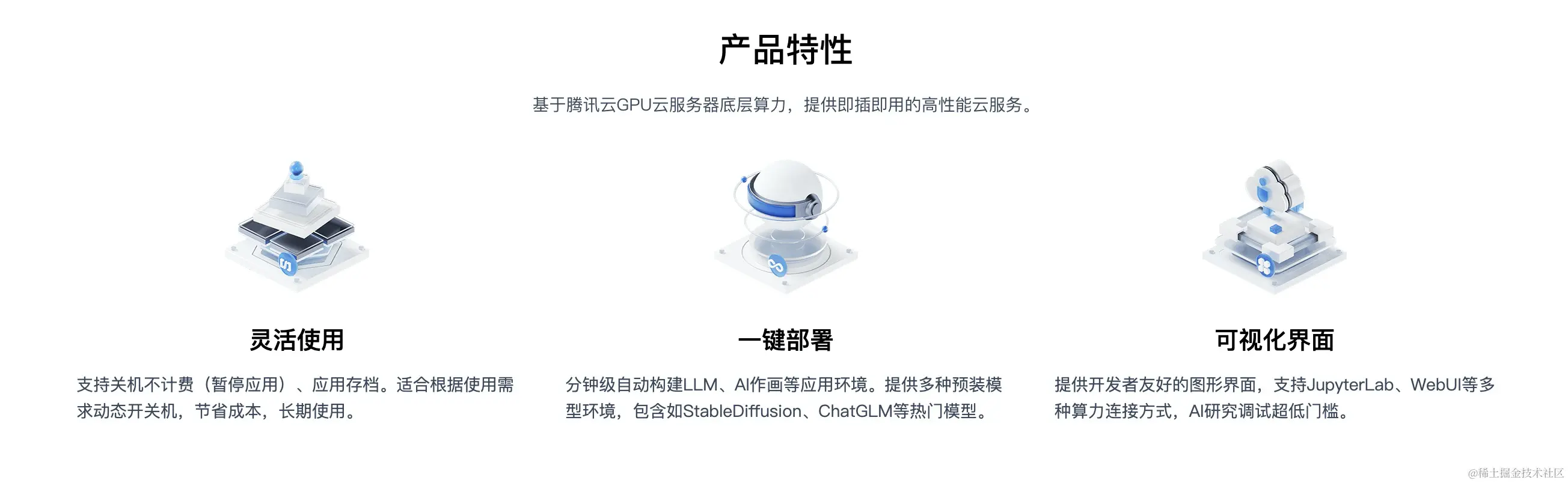 HAI是一款面向AI、科学计算的GPU应用服务产品,提供即插即用的澎湃算力与常见环境。换句话来说,HAI是专门为一些特定场景设计出来的产品,例如AI绘画场景。