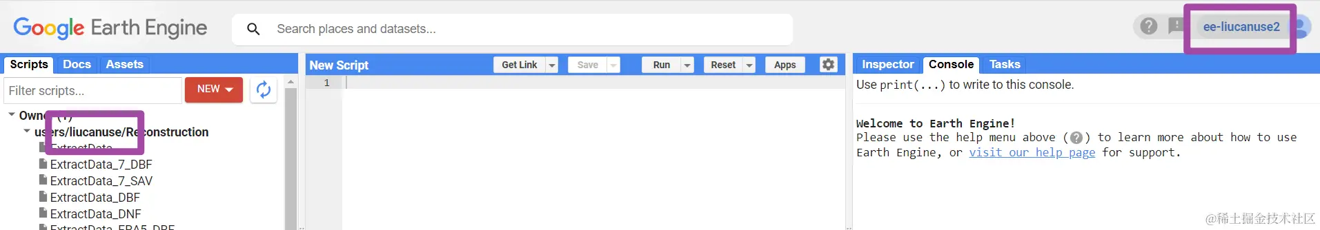 确认无误后,即可进入GEE界面。如下图所示,右上角将显示我们当前的Cloud Project名称,而左侧“Scripts”中,则会显示我们这个Gmail账户所拥有的全部代码脚本。