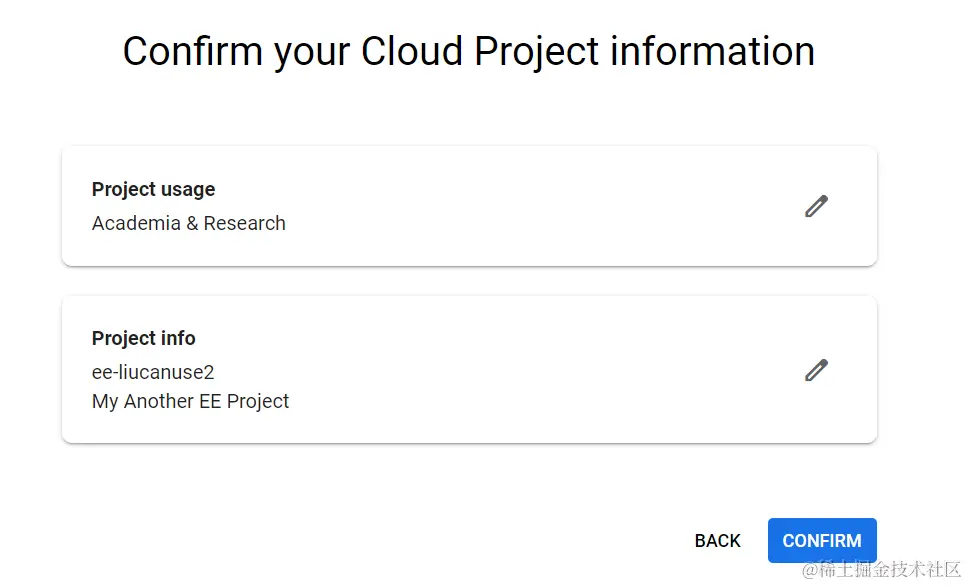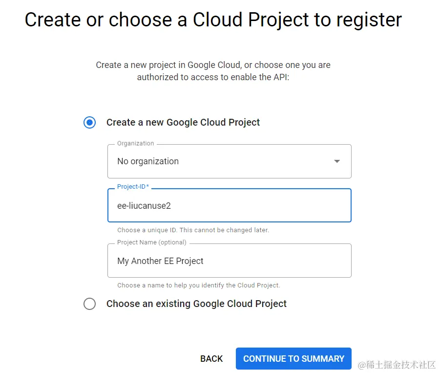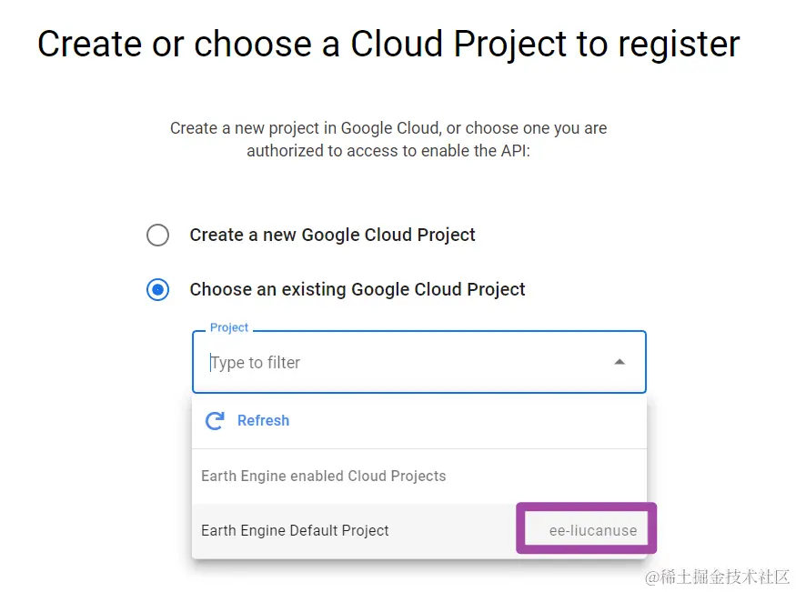 接下来,我们需要选择一下,是用一个新创建的Cloud Project,还是用当前这个Gmail账号原有的Cloud Project,作为我们访问GEE所用的Cloud Project;如下图所示。在我这里,由于原本就用这种方法注册过一个访问GEE所用的Cloud Project,所以就会有如下图所示的界面。