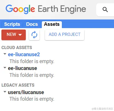 此外,在GEE界面的左侧,“Assets”中也可以看到我们所有Cloud Project中的“CLOUD ASSETS”;如下图所示。