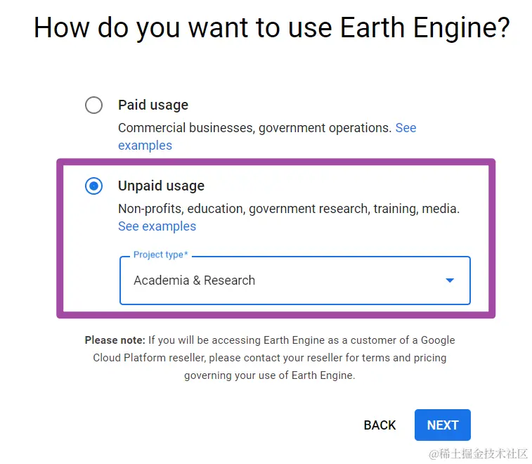 随后,选择“Unpaid usage”选项,如下图所示;并在“Project type”中选择自己这个Cloud Project的类别——建议大家就选择第一项“Academia & Research”选项。