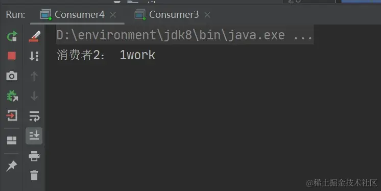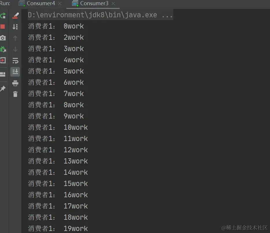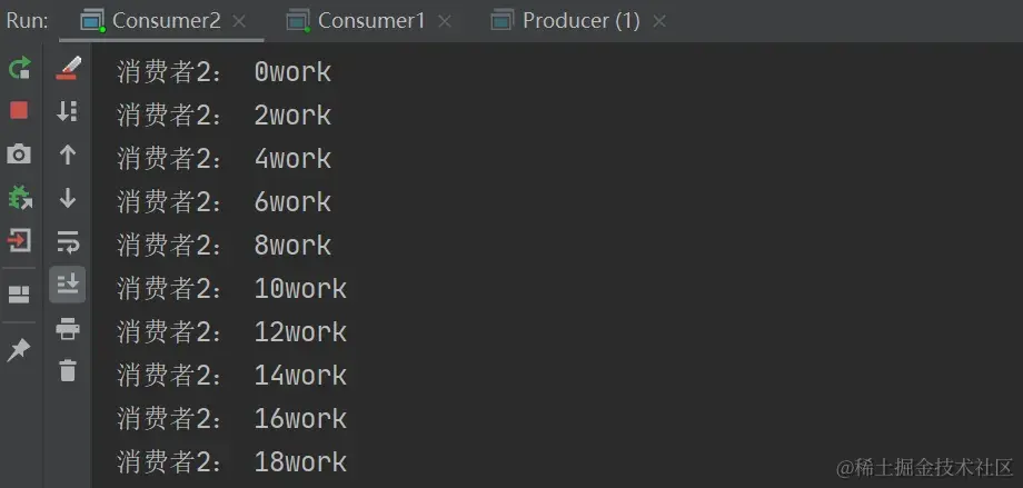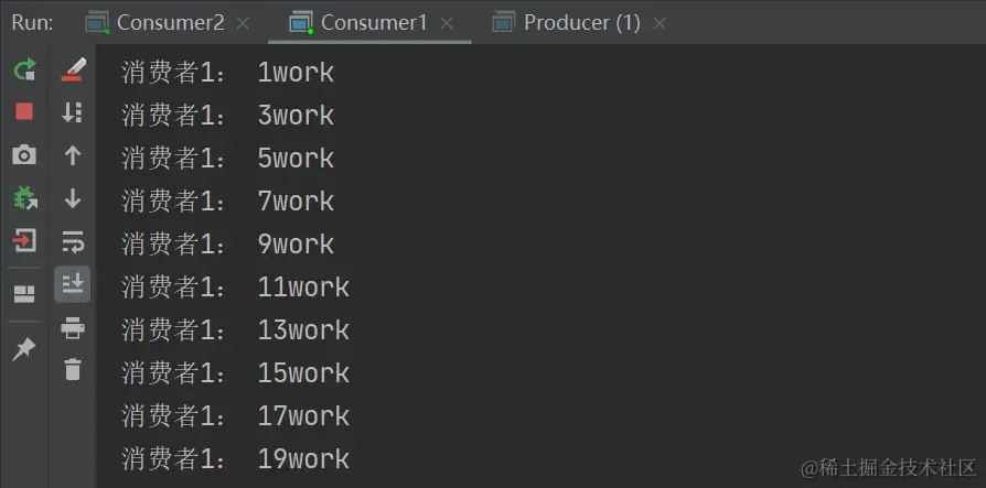 前面看到的是所有的消费者均分消息,会有一个问题,如果一个消费者宕机了,会出现消息丢失现场,希望当出现消费者宕机时,消息被另一个消费者消费,也就是多劳多得生产者代码。