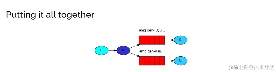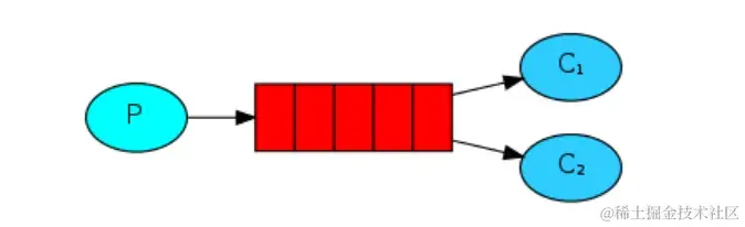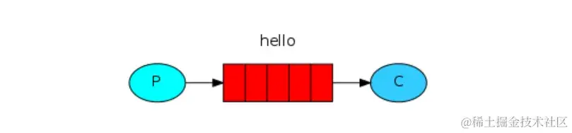 在下图,“P”是生成者,“C”消费者。中间框是一个队列RabbitMQ保留的消息缓冲区 。