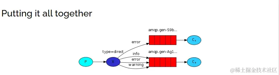 在Direct模型下:队列与交换机的绑定,不是任意绑定的,而是要指定一个RoutingKey(路由key)消息的发送方在向Exchange发送消息时,也必须指定消息的 RoutingKey。Exchange不再把消息交给每一个绑定的队列,而是根据消息的Routing Key进行判断,只有队列的Routingkey与消息的 Routing key完全一致,才会接收到消息。