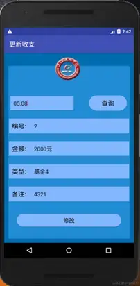 > 记账宝APP基本上达到了预期的目标,可以进行收支的录入,在界面中查询到收支情况,并能对其进行修改、删除操作。但仍有许多不足之处,比如判断收支类别时需要自己手动输入,没有运用下拉菜单的设计,存在数据冗余的情况,时间录入时同样需要手动输入,比较繁琐,我想在后面的设计中加以改进,分别运用时间选择控件和下拉菜单控件,进一步完善其功能。