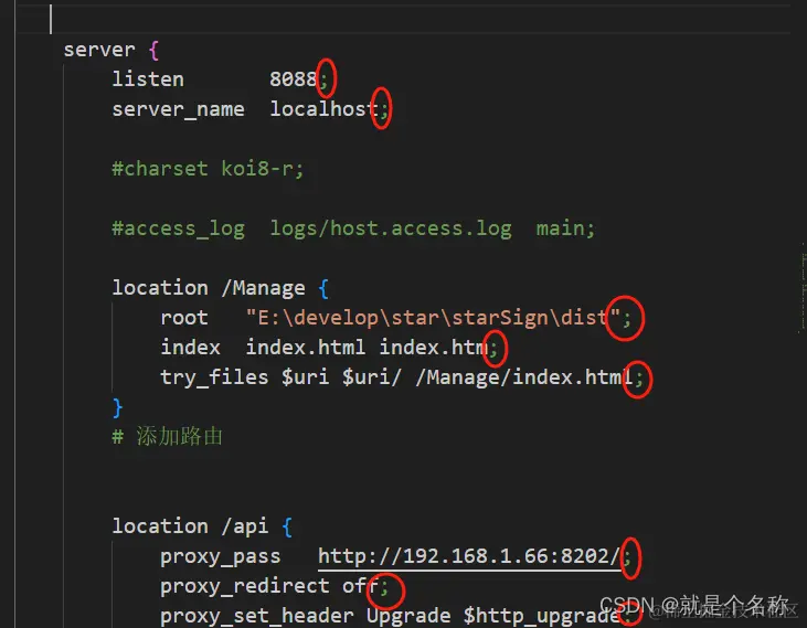 2、我们配置nginx时候,要注意书写格式,每行代码结束需要加 ";" 分号,不然启动nginx会报错,报错日志在logs的error.log看