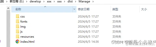 通过路由给的方法 createWebHistory 设置前缀,如果没有前缀 为空或“/”即可,这里我们个我们的路由加上 /Manage 前缀(我这里用的是vue3,如果是vue2 配置base属性)