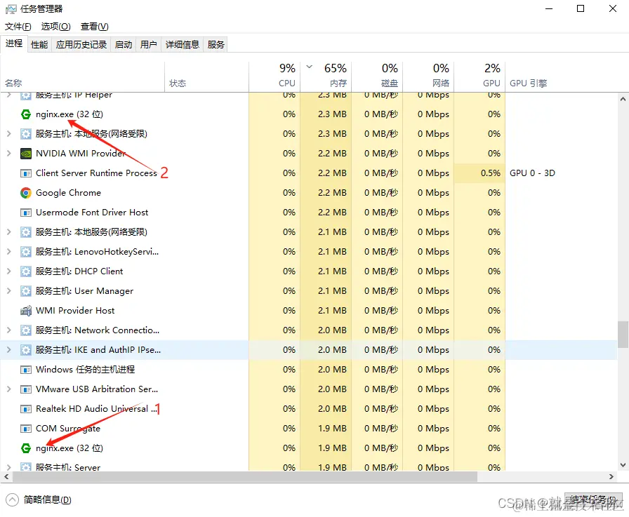 1、每次重启nginx的时候要把上次的服务删除,不然有缓存,关闭nginx服务可以去任务管理器关闭, 任务管理器里两个服务, 先关闭下面的一个, 在关闭上面的一个