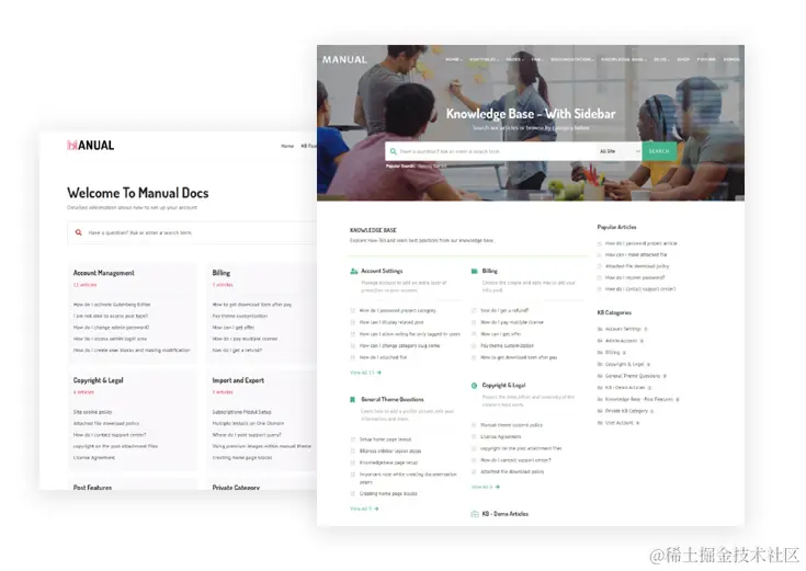 - 强大的功能:手册包含强大的功能,旨在增强您的在线文档体验。从文档、知识库、常见问题解答、作品集、学习系统和论坛到拥有创建专业且功能丰富的网站所需的一切。