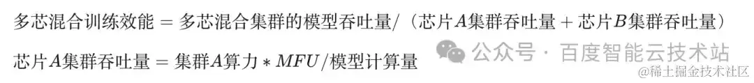 在解决以上三个方面的挑战后,我们就可以开始在这个集群上进行单一大模型下的多芯混合训练任务了。目前,百度百舸的百卡和千卡规模混合训练效能最大分别达到了 97% 和 95%。计算公式如下:
