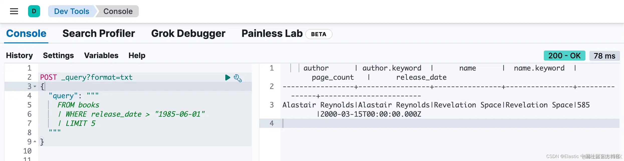 1. const query = 'FROM books | WHERE release_date > "1985-06-01" | LIMIT 5'