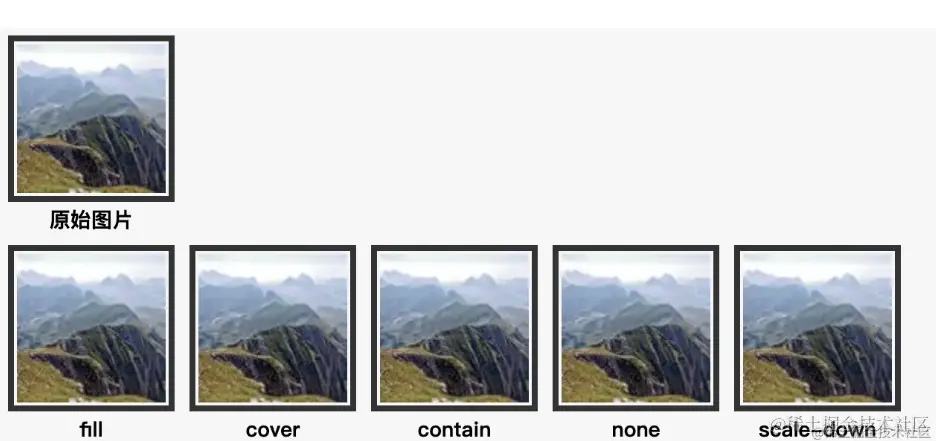 - fill:不考虑图片的比例,将图片缩小或者放大到同 img 元素同样的大小。