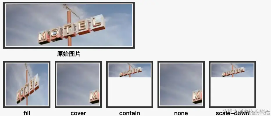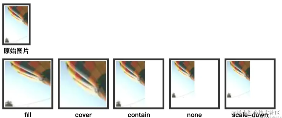 - none:图片按原始大小显示,根据 object-position 属性显示左上区域,超出部分被裁剪