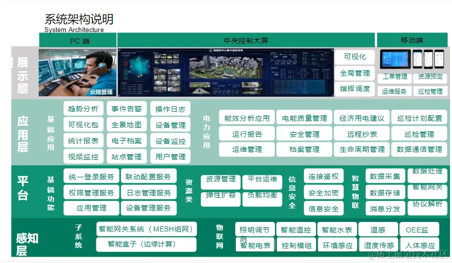 智慧能源管理平台包含能源采集、能耗监控、暖通空调、新风净化、安防监控、设备管理、智能控制、智能分析等自定义组合系统。通过信息化智能化系统集成,采用分散控制和集中管理模式,对所有能耗数据进行采集储存、统计分析,利于实时掌握系统运行情况,及时采取控制调度措施,强化异常处理的快速响应。