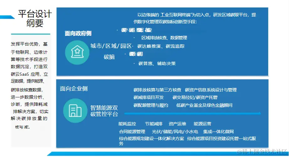 分享1份企业(园区)智慧能源双碳平台解决方案····,该方案对园区综合能源系统进行整体纳管监控,通过仿真预测, 提高综合能源利用效率。助力可再生能源的开发利用,结合地理与气候条件, 发展适用的园区可再生能源, 监测已建成的能源系统, 提高供能的稳定性, 合理开发与利用可再生能源。保障能源供应安全,对源端供应设备, 进行24小时不间断监控与巡检,通过仿真预测系统, 及时发现安全隐患, 保障能源供应的安全可靠。值得参考借鉴~