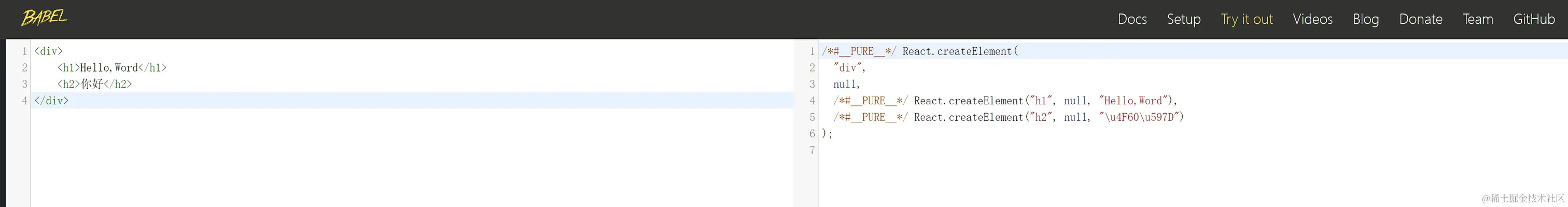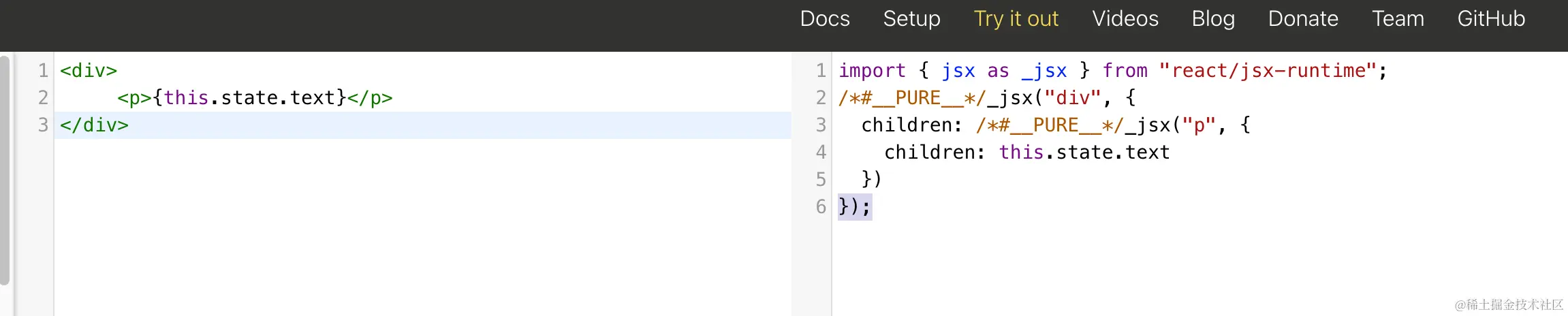 可以清楚的看到,我们的div标签和p标签都被转为了_jsx调用。JSX语法看起来很像我们之前写的HTML标签套了模板语法的样子,但是只是看起来像罢了,在React17之前JSX 的本质是React.createElement这个 JavaScript 调用的语法糖,但是在React17之后_jsx替换了React.createElement。