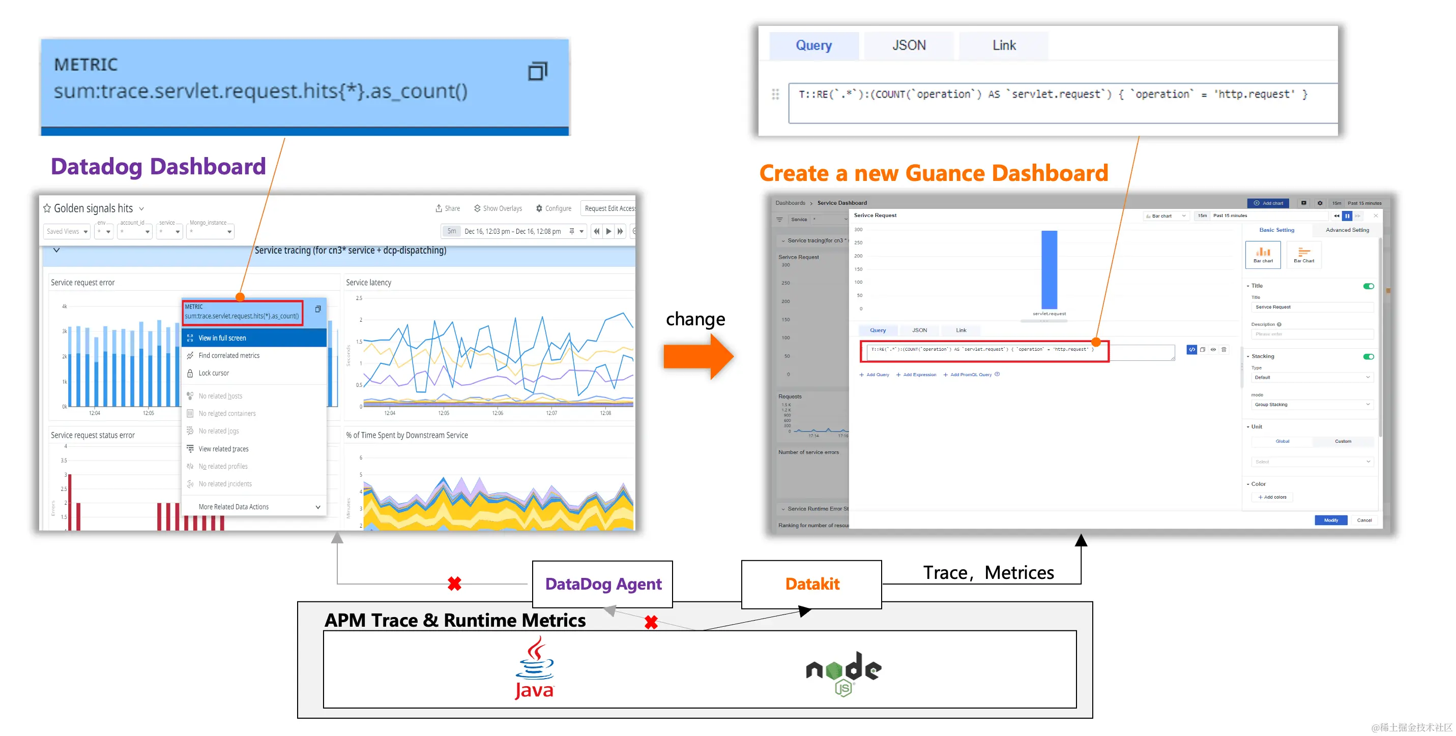 观测云对 DataDog 生态系统有着高兼容性,包括对 DataDog 的 DDTrace 的全面支持。这种深度兼容意味着用户在迁移过程中无需修改或重构现有的应用程序。这不仅节省了大量的时间和资源,也减少了技术债和潜在的风险,使得迁移过程更加顺畅和无忧。