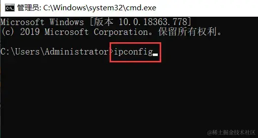 步骤2:打开管理员窗口后,输入**【ipconfig】,再按下【Enter】**键。
