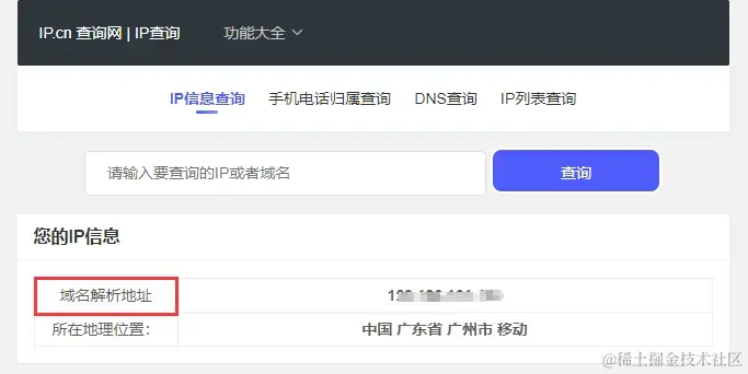 步骤3:打开IP查询界面,在**【域名解析地址】**这里进行查看即可。