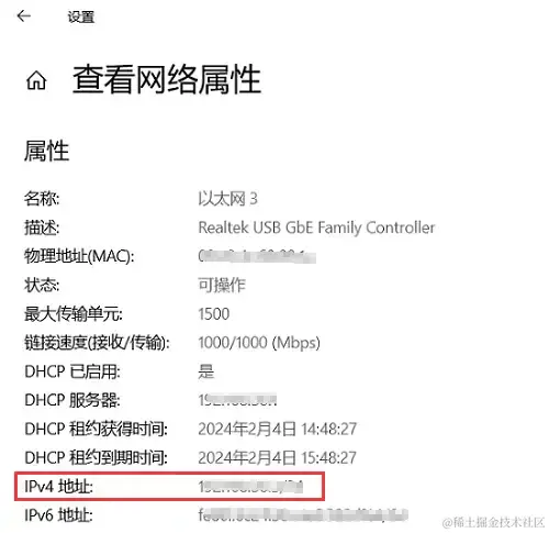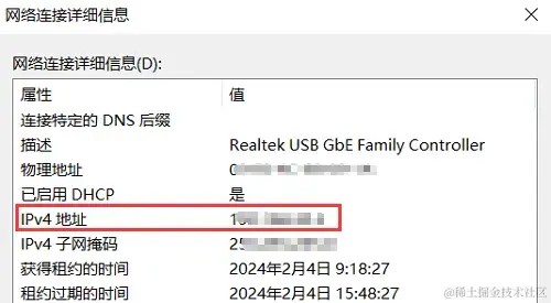 步骤4:在弹出的窗口中找到并查看**【IPv4地址】**,即可查看本机的IP地址。
