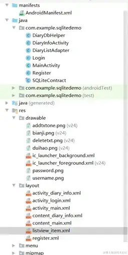 核心的java代码文件,以及根据实验5之后多出来的登录界面的布局文件,如下图为所有的文件详情。