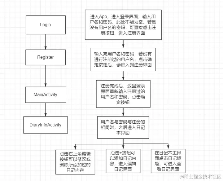 - 如果用户名(username)和密码(password)在SharedPreferences中存在的话,则跳转DiaryActivity;