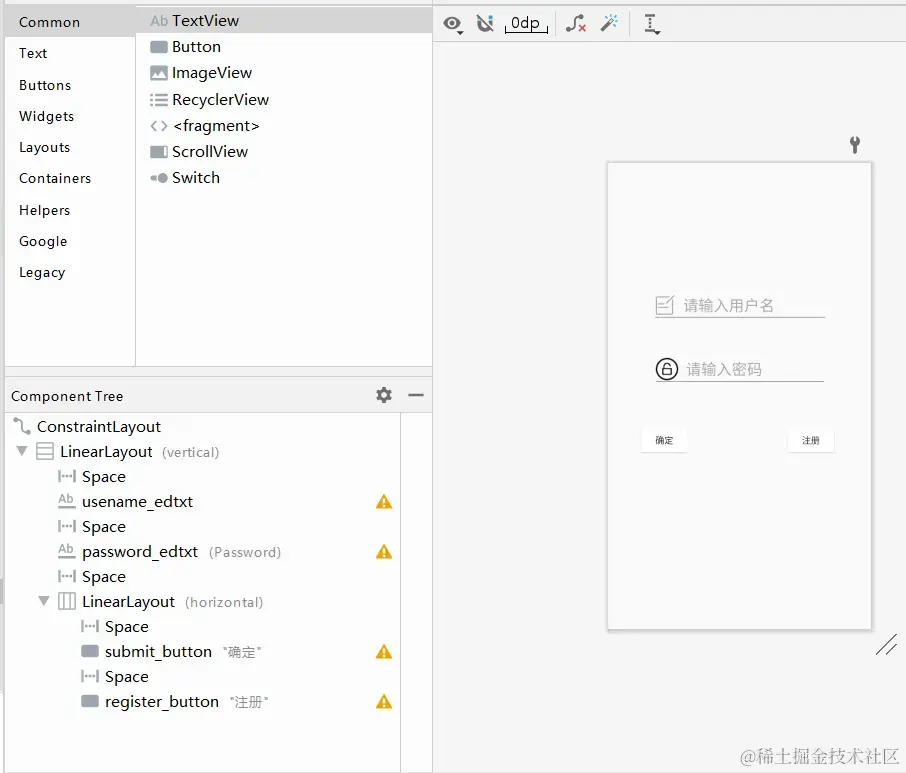 登录界面采用简单而常用的linerLayout布局,注册界面同样也是