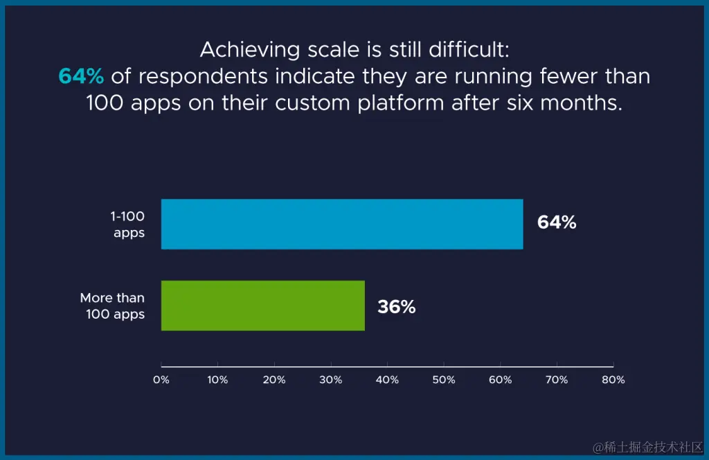 即便如此,价值之路仍然难以捉摸;MVP 发布六个月后,其中 64% 的平台支持 100 个或更少的应用,表明价值实现周期延长。这种缓慢的进展会严重影响组织的竞争力和利润。即使是拥有复杂技能的企业也发现难以有效地将他们的应用推向市场。结果呢?错失机会和资源紧张。