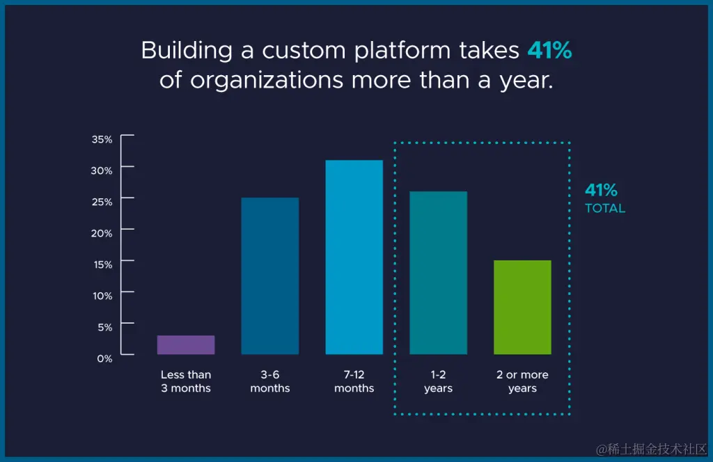 今年研究中最有趣的见解之一涉及定制构建平台持续存在的挑战。虽然 61% 的受访者表示他们的至少一个平台是定制构建的,但从概念到实施的过程远非顺利。令人担忧的是,其中 41% 的组织花费了一年多的时间来开发 最小可行产品 (MVP)。
