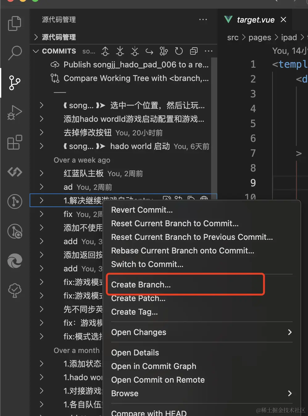 或者在vscode的代码管理里面,点击某一次提交,右键:creat branch 也是可以的